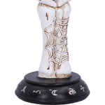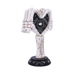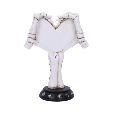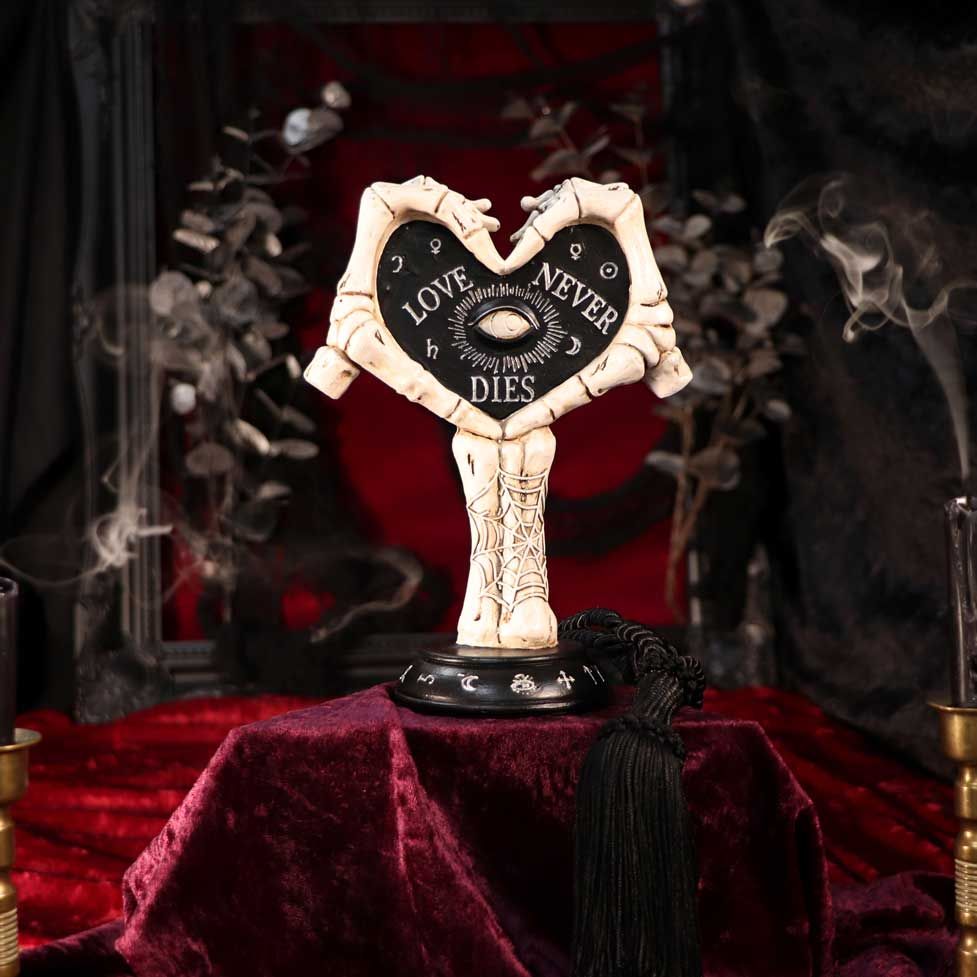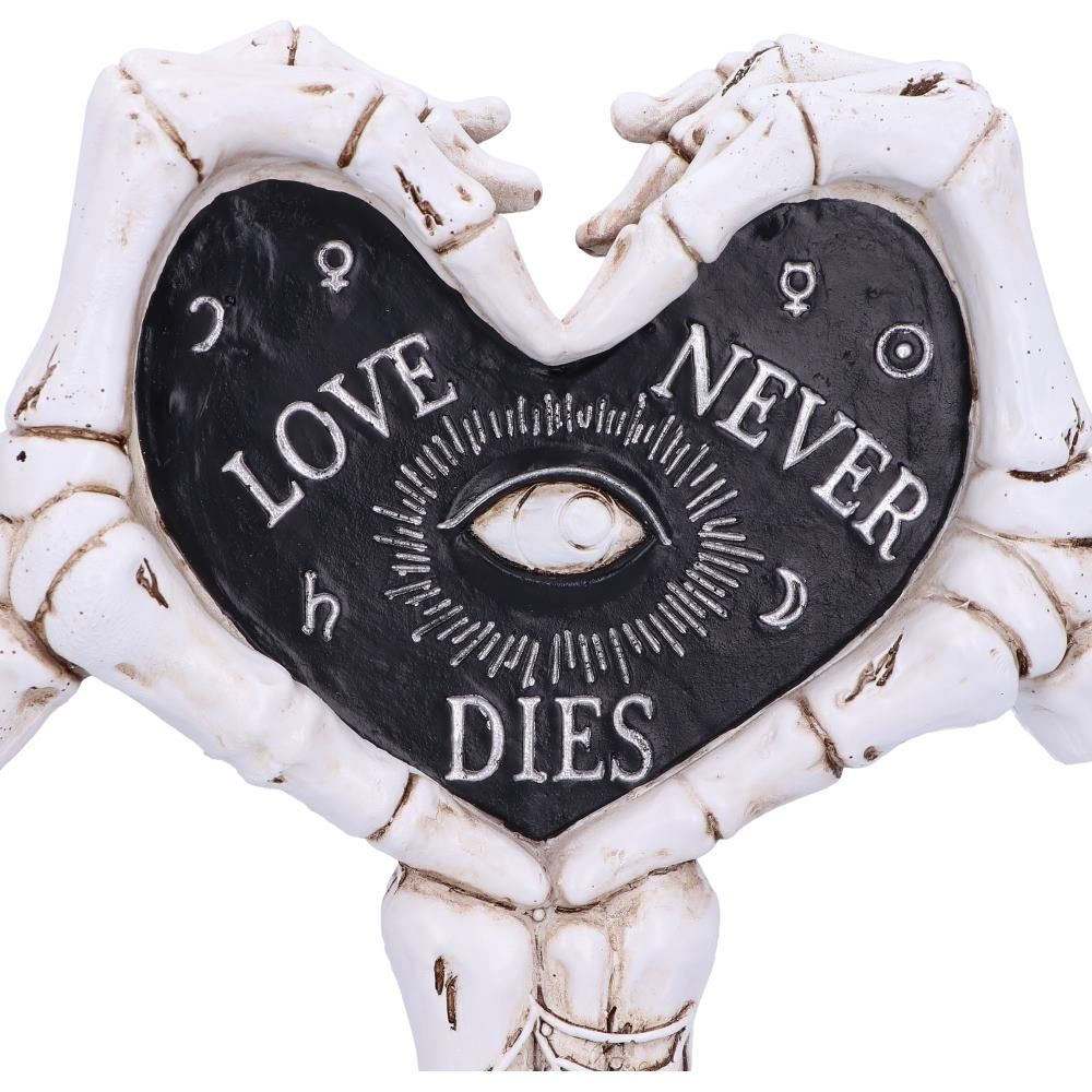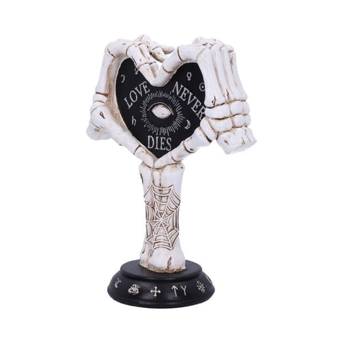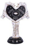 A pair of skeletal hands and disjointed ulna and radius bones appear from a black base, covered in white symbols. These detailed hands do not have an ounce of flesh, meaning that death took its grasp a very long time ago, and are decorated with a simple white web design. In the hands grasp is a black heart, emblazoned with the words 'Love Never Dies' and a large white eye. Cast in the finest resin, before being painstakingly hand-painted.