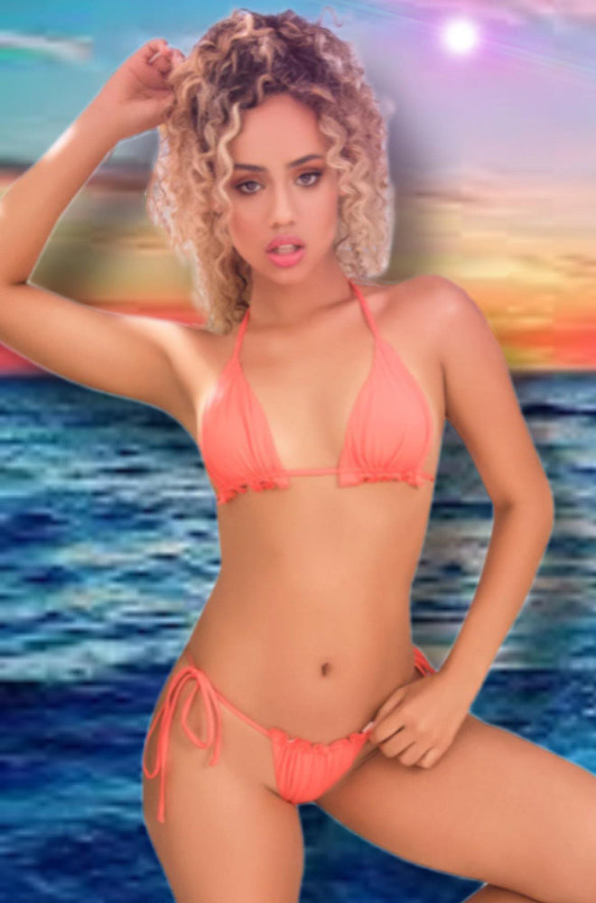 This sexy two piece bikini set featuring adjustable triangle cups with a ruffled trim, halter ties, a tie back closure, and a matching bottom with a narrow crotch panel, tie sides, and a thong cut back.