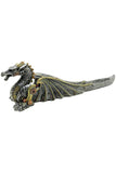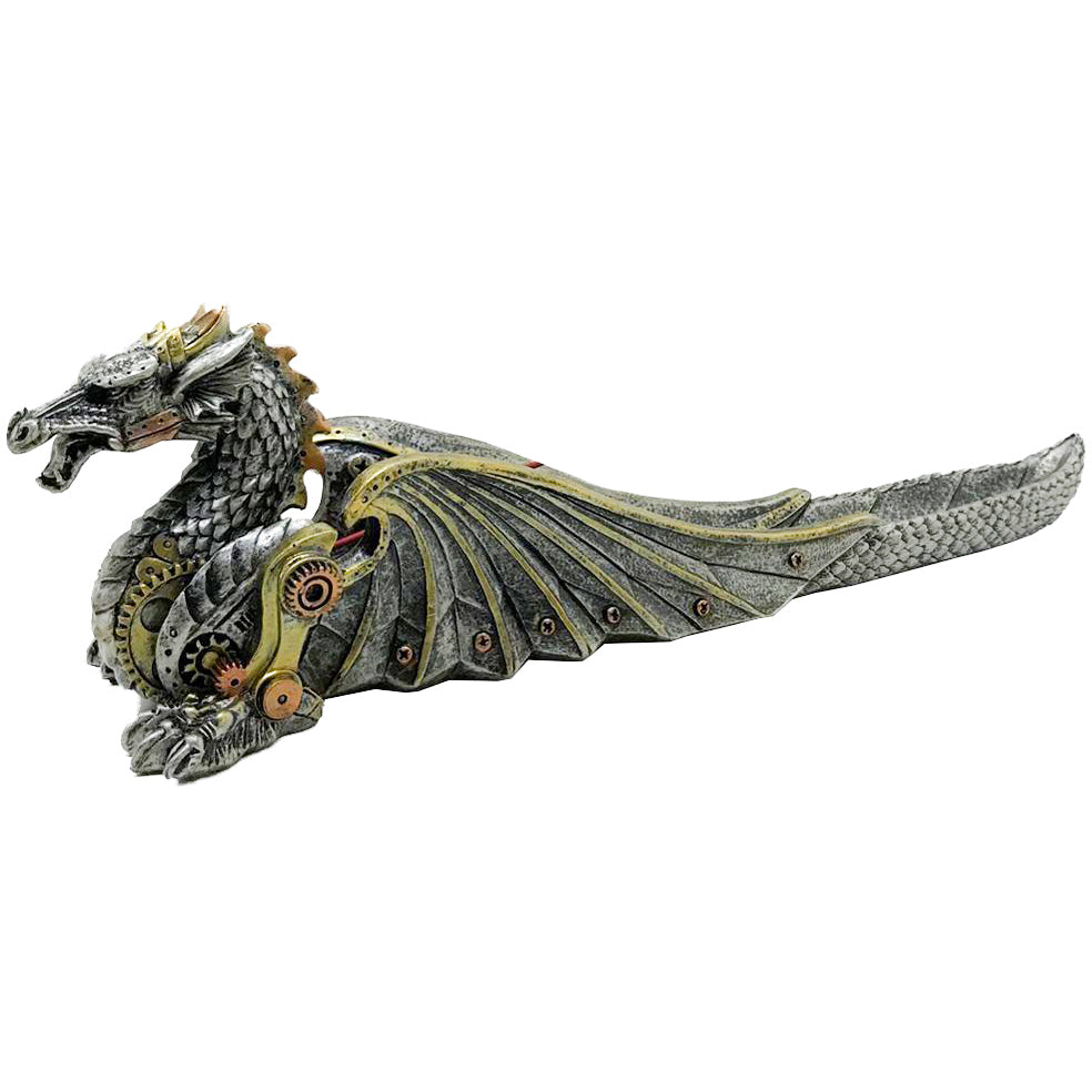 Spread the scent of a Dragon’s breath with the Mechanical Fire incense burner. Lying on the ground, a mechanical Dragon rears their head up to roar, interlocking plates of their underbelly showing. Their steel wings protect the sides of their long tail, curved inwards to catch ash. Cast in the finest resin before being carefully hand-painted.