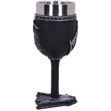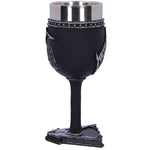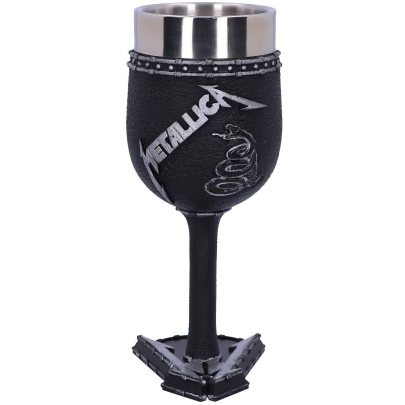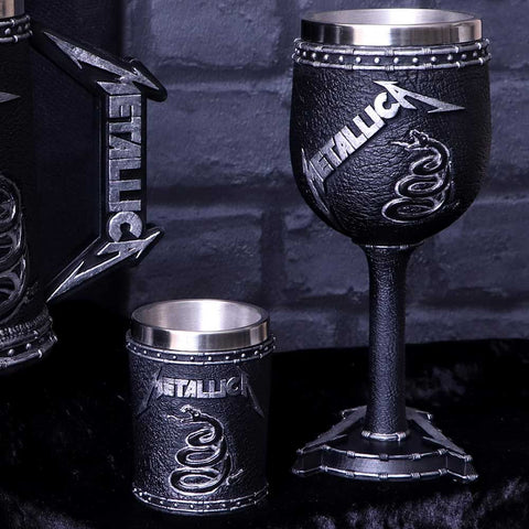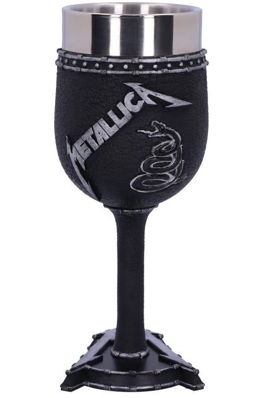 Have your favourite Metallica album artwork on display at all times with this exquisite Goblet. Featuring the understated artwork from their self-titled fifth studio album, the Metallica logo sits above a coiled snake on a black background. The "M" from the logo is mirrored in the foot of the Goblet stem, which is cast in the finest resin before being expertly hand-painted. This piece comes with a removable stainless steel insert and is the perfect way to pay homage to one of the most influential heavy metal bands of all time!