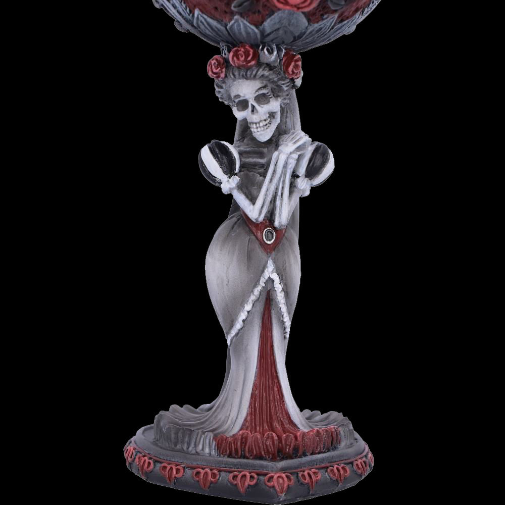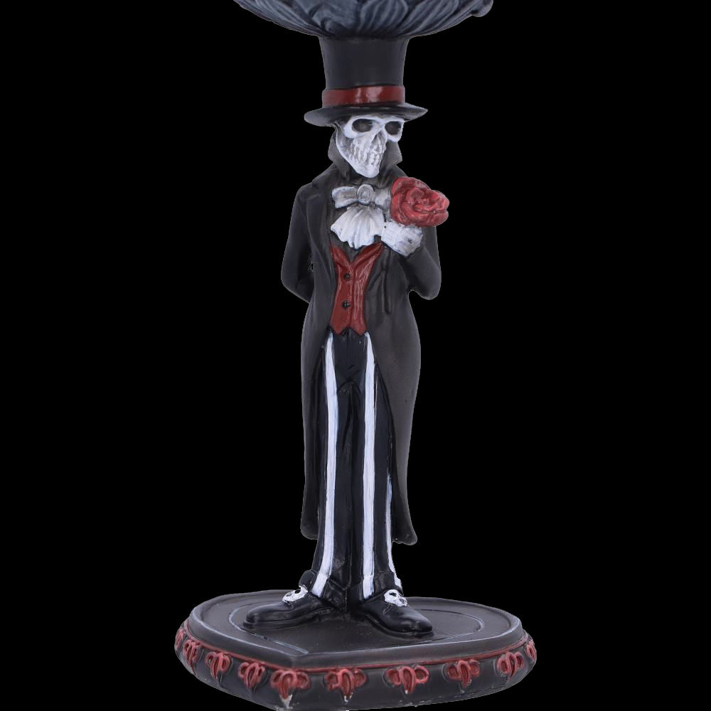 As the stem of the goblet, this skeleton wears a beautiful Edwardian dress, with her hair made up of dried flowers and held up with a single rose. While the bowl is adorned with ornate patterns and roses, alongside a prominent 'Mrs' in the centre. Cast in high-quality resin before being expertly hand-painted, this piece is the perfect way to add a touch of gothic romance to any wedding day.