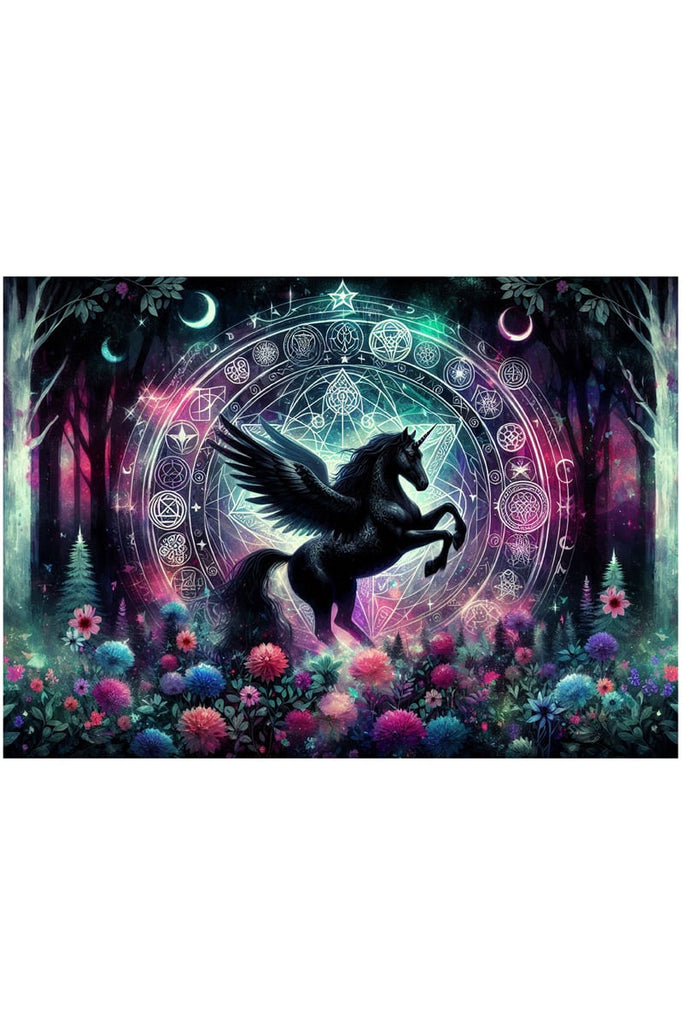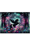 A black unicorn, in a fairytale forest, stands in front of a mystic portal.