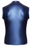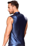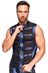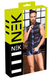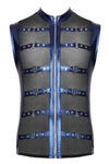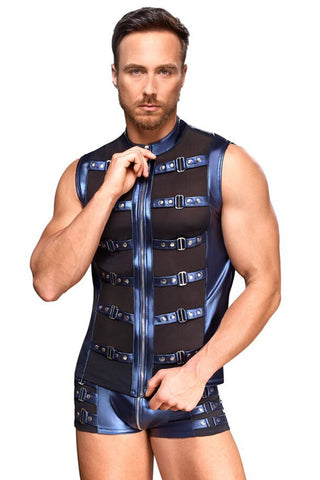 A cool mix of materials in a strap style! The tight, emphasising shirt from NEK has a small stand-up collar and a full-length front zip. The shirt is made out of cool metallic blue matte look material and there are also straps at the front with stud decoration as well. There are transparent black powernet inserts underneath the straps. It is soft and stretchy for perfect and comfortable fit.