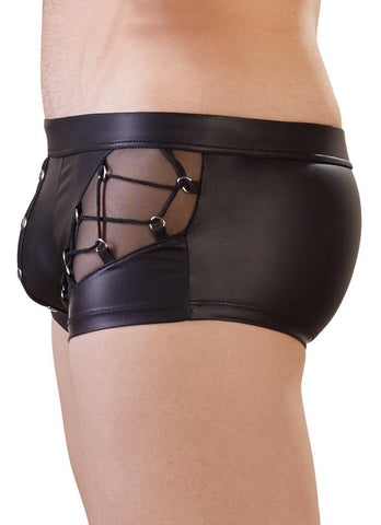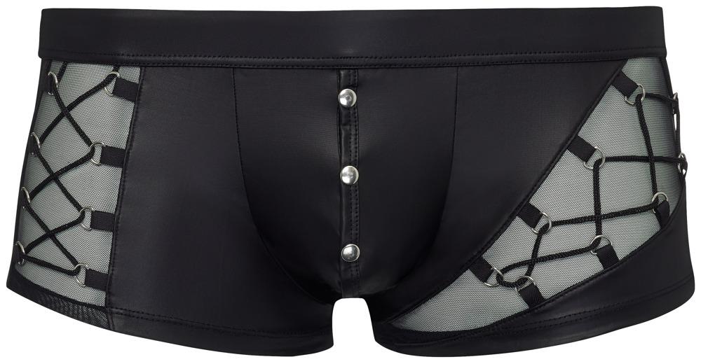 A beautiful and exclusive design! Stretchy pants in a beautiful matte black look with powernet inserts at either side. There is decorative lacing over the inserts. There are press studs on the pouch so that it can be opened.