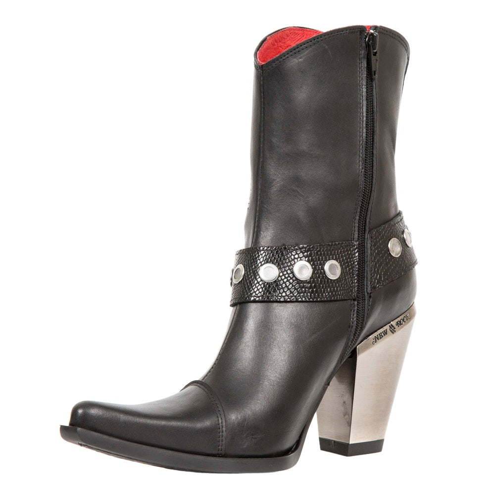 A functional boot strap with a metal New Rock badge adds a touch of brand recognition and complements the overall look. The finishing touch comes with a metal heel, adding a hint of durability and subtly nodding to the boot's Western heritage.
