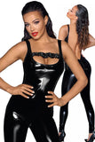 This alluring PVC overall has a 2-way zipper in a crotch and low-cut back. This look wouldn't be complete without the frilled chest strap which draws eyes to just the right places.