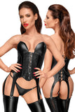 Very stretchy (power) wetlook in a shiny matte black look! This corsage with suspender straps stands out from the rest because it has a hook fastener and embroidery at the front, and lacing down the back. With bones, removable bra straps and 6 suspender straps. Tight-fitting.