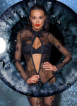 Crafted from the finest soft tulle, this jumpsuit boasts a mesmerizing, sheer fabric adorned with delicate velvet flock embroidery. The long sleeves and legs create an ethereal and elongated silhouette. The standout feature is the versatile three-way zip, allowing for endless styling possibilities and easy access.
