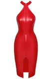 This striking red dress is crafted from a stretchy Power Wetlook fabric, offering a perfect blend of matte and subtle shine for a sophisticated yet bold look. The material provides a comfortable fit, hugging the body while allowing ease of movement.
