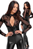 Exclusive style in a luxurious mix of materials! Emphasising jumpsuit from Noir in a tight cut with long sleeves and legs. Elegant, black powerwetlook with transparent, subtle velvet-flocked stretch tulle top. Soft and stretchy for a snug fit with maximum comfort. Large keyhole neckline at the front and back. Stand-up collar to close with buttons at the front. Full-length 2-way zip from the waist through the crotch to the bottom.