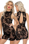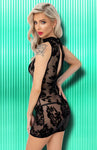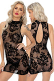 Delicate transparent material in an exclusive design! The short, sleeveless dress from Noir is made entirely out of delicate stretchy tulle with a velvet flock print in a sophisticated floral design. It is also soft and stretchy and this means that it is very comfortable to wear. It is tight-fitting and has a large oval cut out at the back. The stand-up collar has a button at the back that can be used to fasten it.