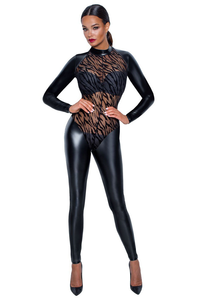 Provocative jumpsuit in an exclusive design! Long sleeve jumpsuit from Noir that is completely made out of power wet look. There is a transparent powernet insert at the front with a delicate velvet flock print in a tiger design. Everything is stretchy and fits like a second skin! A special highlight is the practical, erotic 3-way zip that starts at the back of the neck and goes over the crotch.