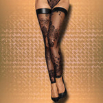 Crafted from the finest soft tulle, these stockings boast a mesmerizing patterned flock embroidery that adds a touch of opulence. The powerwetlook band at the top ensures a secure and comfortable fit, while the sheer fabric creates a captivating interplay of light and skin.