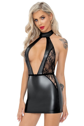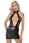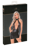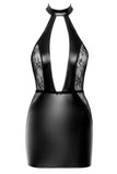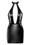 An exclusive style made out of a beautiful mixture of material! The short dress from Noir is made out of shiny matte power wet look material. It also has fancy lace insiders at the sides and at the back. It has an exciting design because of its very low-cut cleavage area that goes right down to the belly button and the fact that it is almost entirely backless. The dress also has a halterneck choker that fastens at the back of the neck and a waistband with a fastener at the back.