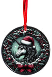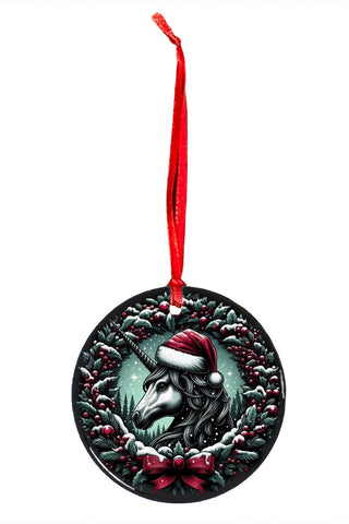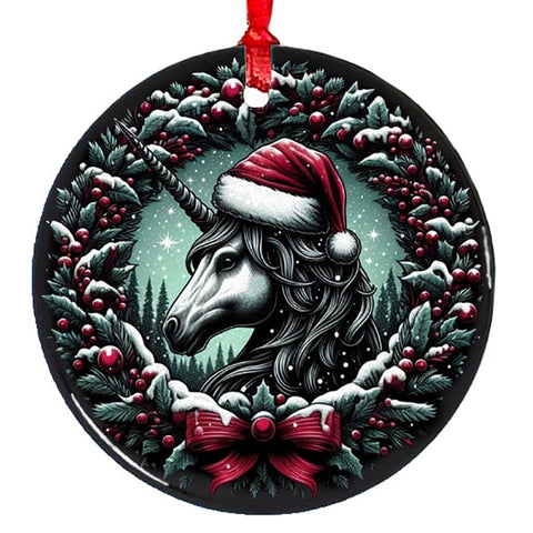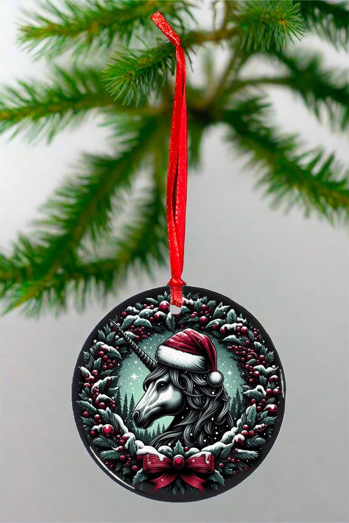 This double-sided ceramic ornament features an enchanting black unicorn head with a spiraled horn, topped with a cheerful Santa hat. The majestic creature is set against a beautiful blue starry night and framed by a classic Christmas wreath of ivy and holly. The design is printed on both sides, ensuring its detailed charm is visible from every angle on your tree.