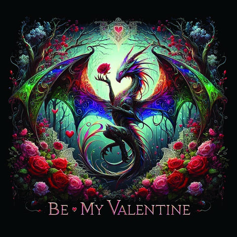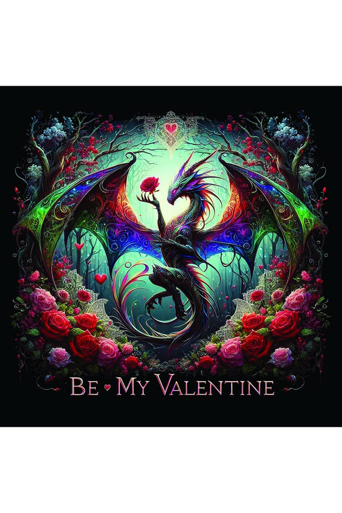 The magnificent front design features a majestic dragon with its wings spread wide, its form bathed in the mystic aura of a blue-green light. A symbol of strength and passion, the dragon gently holds a single red rose in its taloned claw, a beautiful contrast to its fierce appearance. The scene is set before a dying forest and framed by a border of bright, enchanting flowers. At the bottom, the bold words "be my valentine" complete the message.