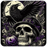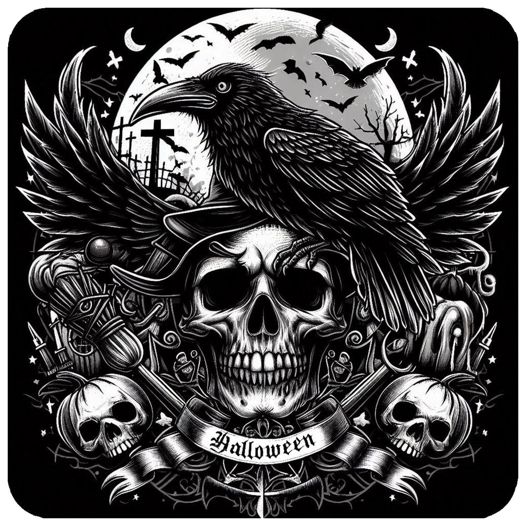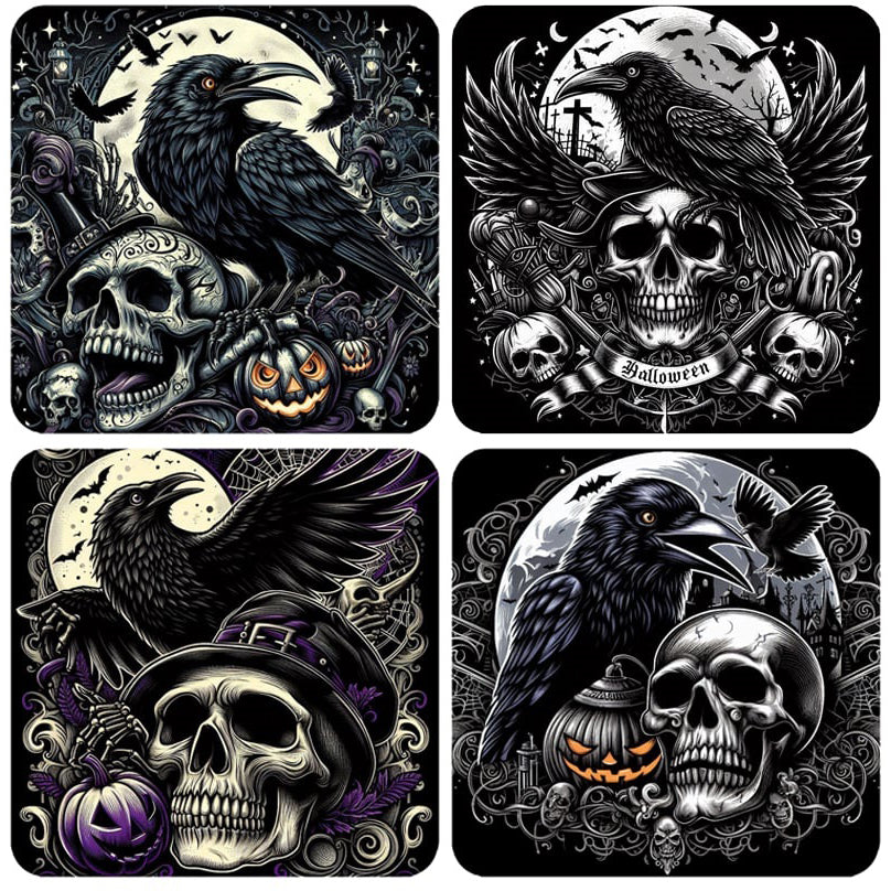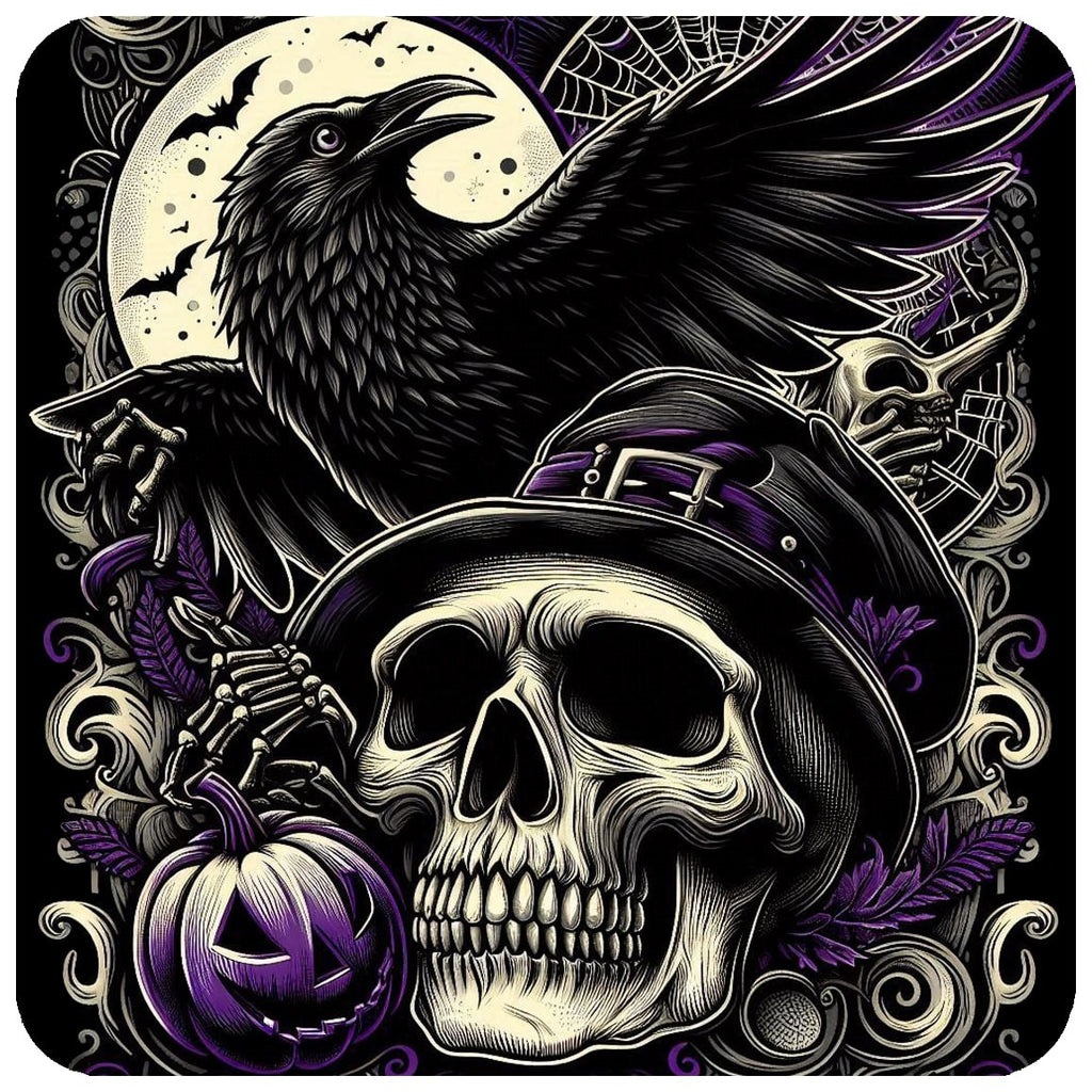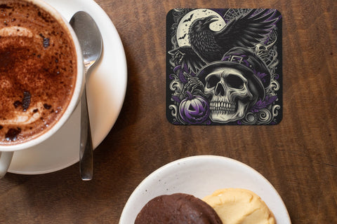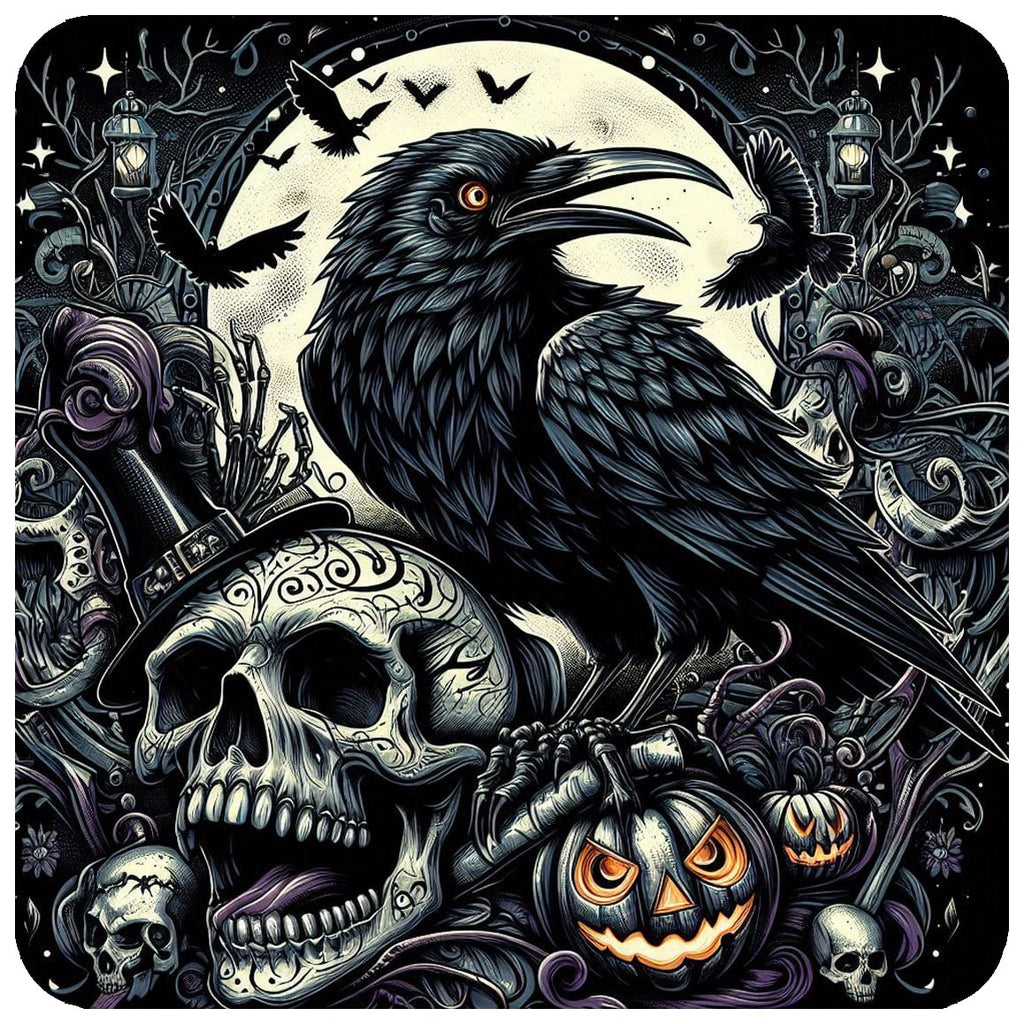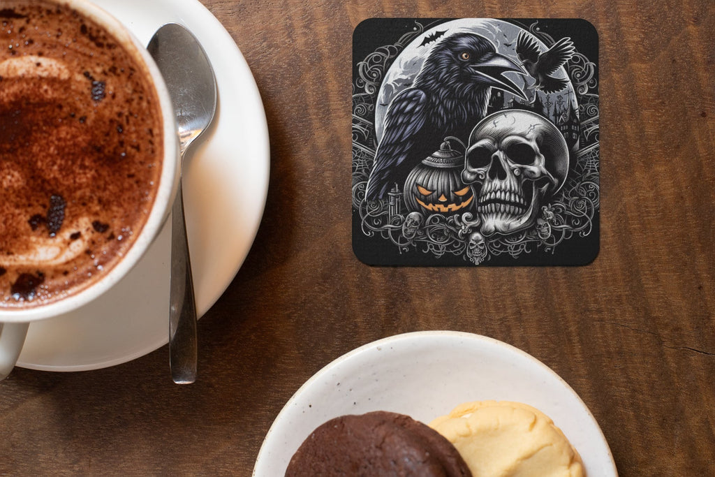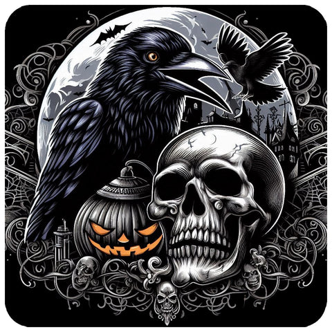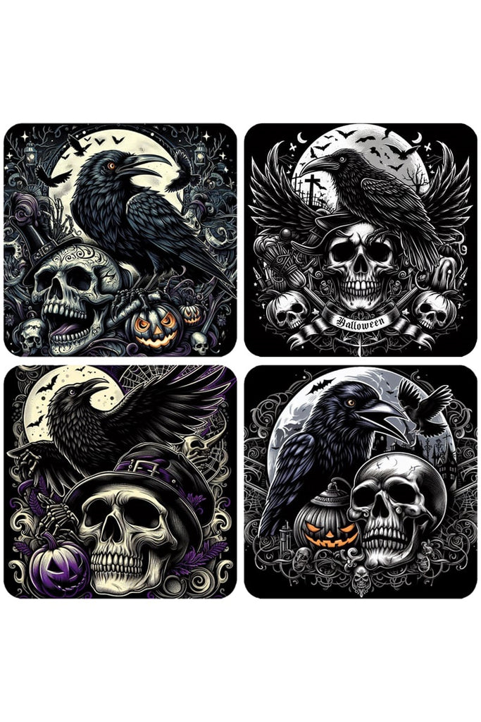 This set of four cork-backed coasters features a compelling design that perfectly captures the spirit of the season. Each coaster showcases a powerful raven perched atop a haunting gothic skull. Ravens have long been seen as mediators between life and death, and in folklore, were even believed to be ridden by witches. Adding to the macabre scene are subtle black, evil pumpkins, bringing a classic Halloween touch to this unique, detailed artwork.