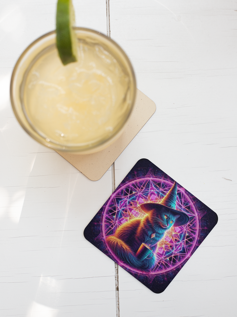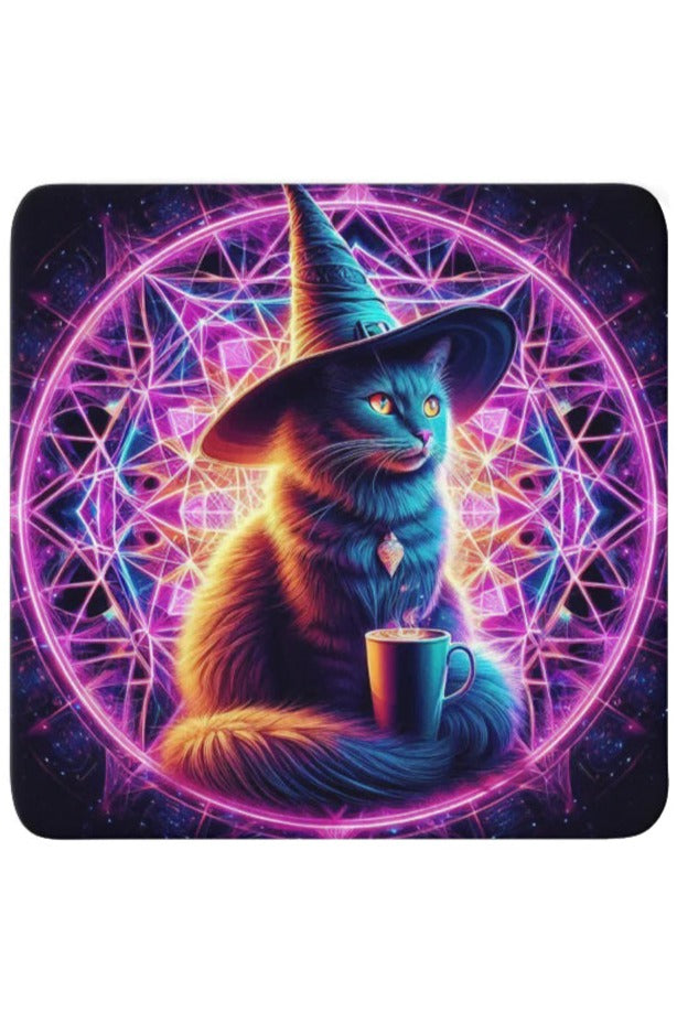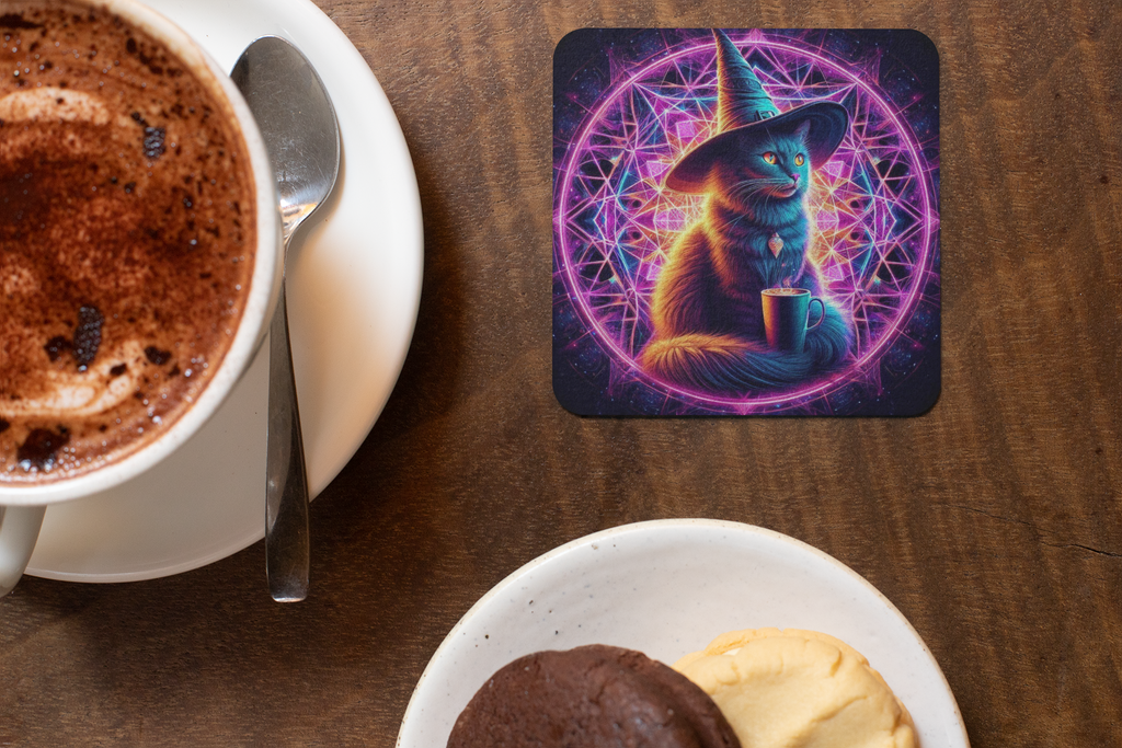 Cork Backed Coaster featuring a Cat in a witches Hat, drinking a mug of coffee.