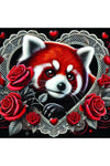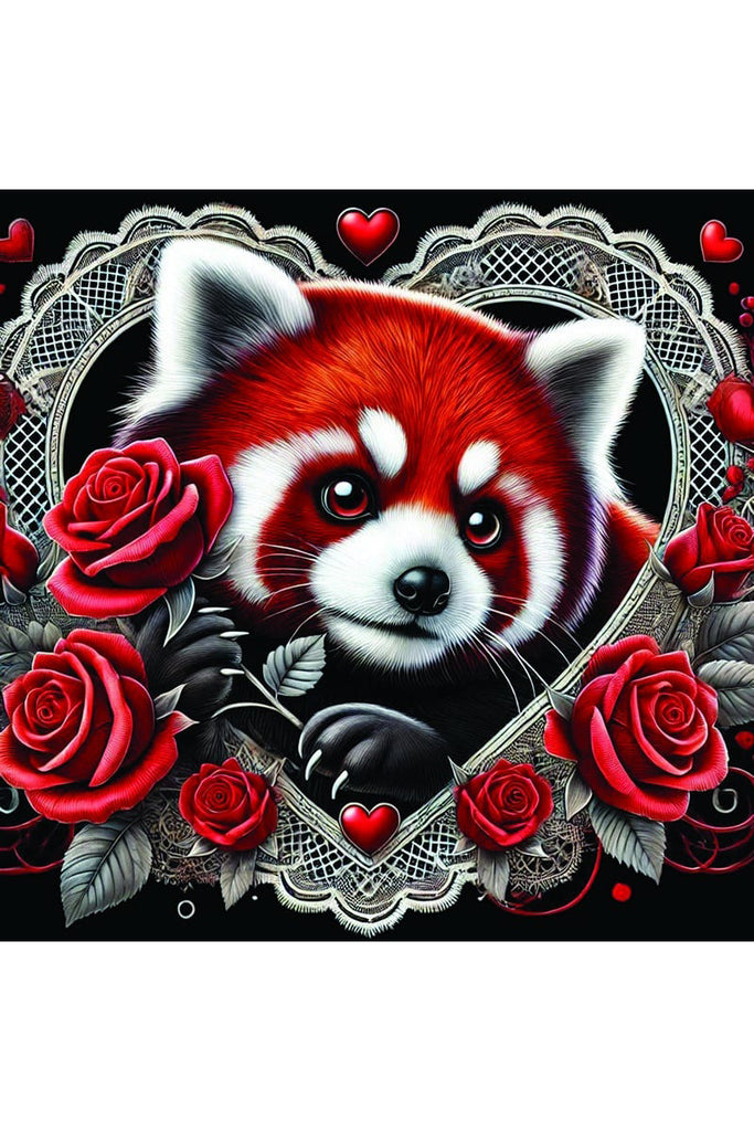 The heartwarming front design features an adorable red panda peeking out from a heart, holding and surrounded by beautiful red roses. The enchanting scene is set against a sleek black background, sprinkled with small floating red hearts that add a touch of whimsy.