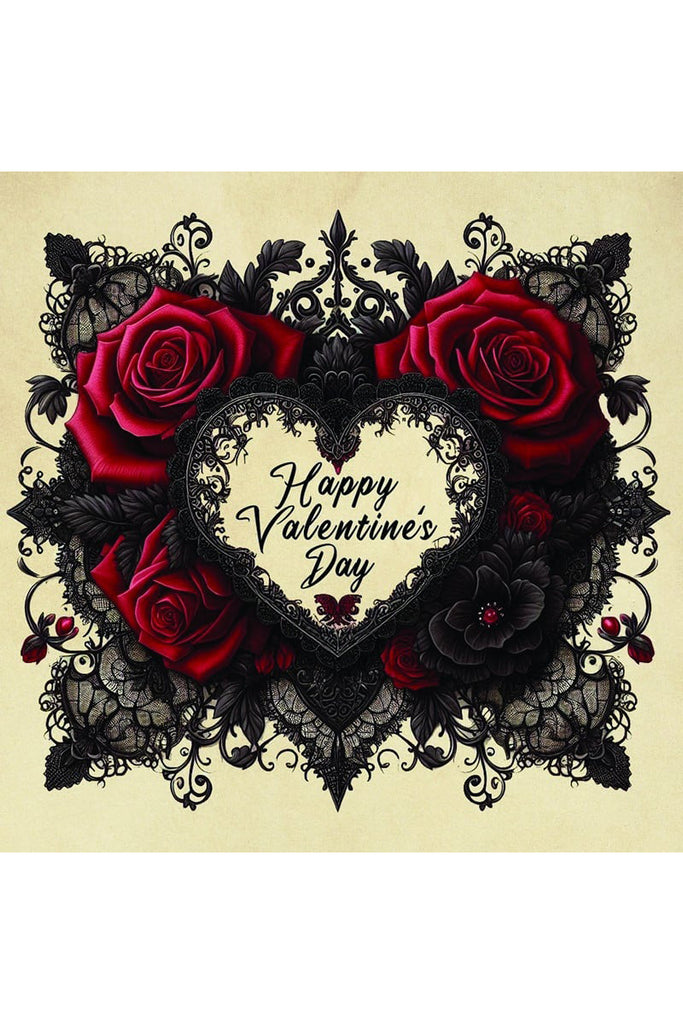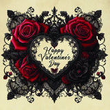 The stunning front design features a detailed heart wreath meticulously crafted from a mix of rich, dark red roses and intricate gothic black lace. This captivating wreath stands out beautifully against a subtle, sandy-colored background, creating a timeless and sophisticated aesthetic.