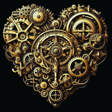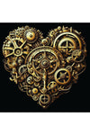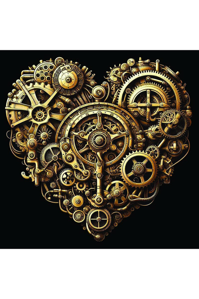 The striking front design features a heart meticulously composed of detailed bronze cogs, set against a sleek, totally black background. The contrast between the intricate metallic gears and the deep black backdrop creates a sophisticated and eye-catching visual that is both romantic and bold.