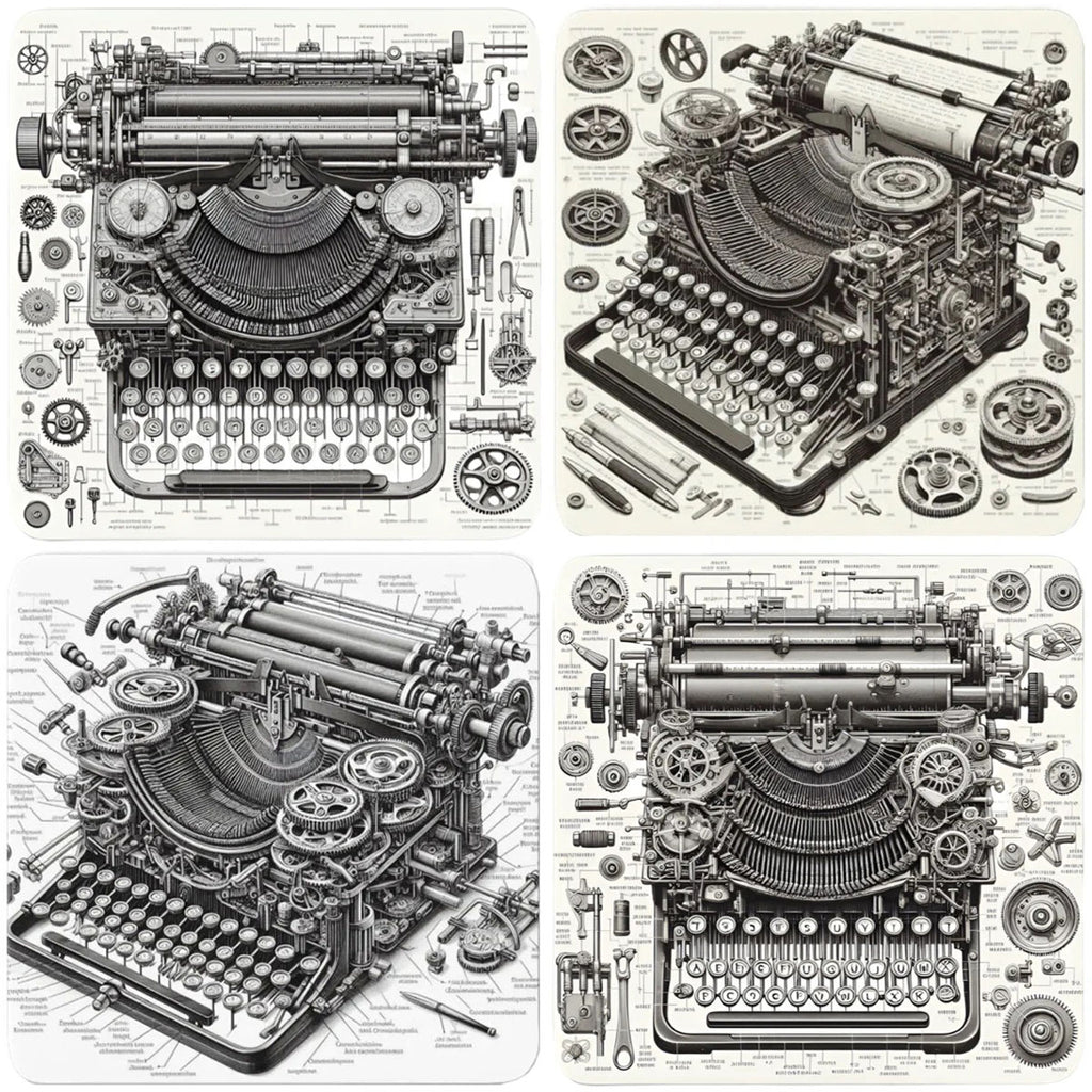 This captivating set of four cork-backed coasters features a unique design that is more than just a simple typewriter. Each coaster depicts a mystical mechanical device, surrounded by a cascade of spare cog parts and scribbled, intricate notations. The artwork suggests that these are not just tools for writing, but powerful instruments of invention and fantasy, ready to craft the next great story. This set is a perfect blend of retro-futuristic style and artistic storytelling, a must-have for any steampunk enthusiast.