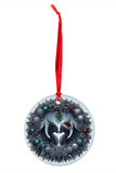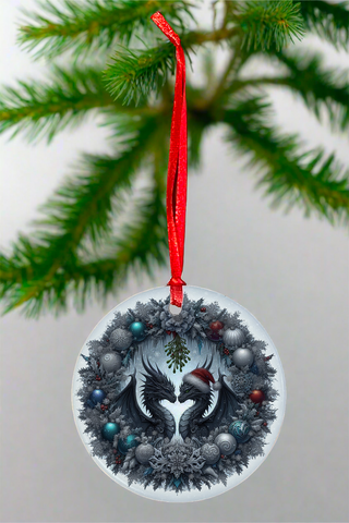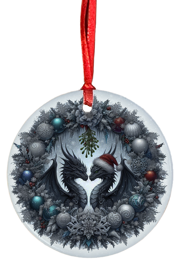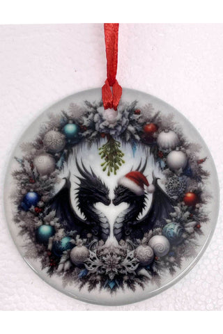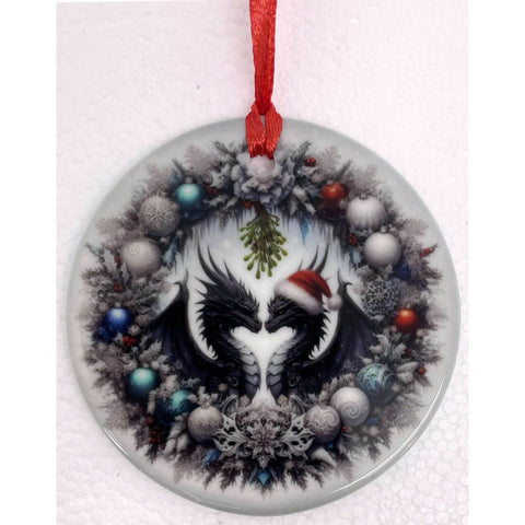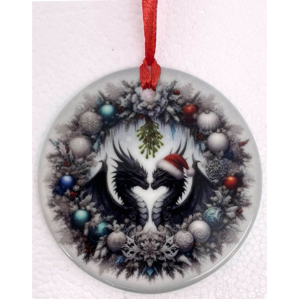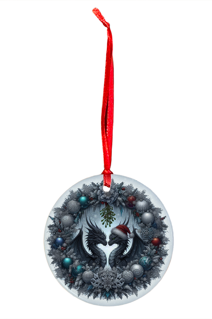 This round ceramic ornament features two magnificent black dragons, captured in a striking face-to-face gaze. One of the dragons wears a playful Santa hat, while a sprig of mistletoe hangs above them, creating a charming and whimsical scene. The dragons are beautifully framed by a traditional Christmas wreath with baubles, and the design is double-sided, ensuring its captivating details can be seen from any angle.
