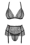 This three-piece set, featuring a bra, garter belt, and a classic thong, is a true statement of confident style, combining soft, delicate lace with alluring details to create a look that is both captivating and incredibly comfortable.