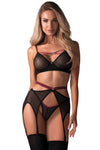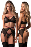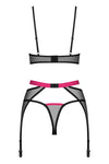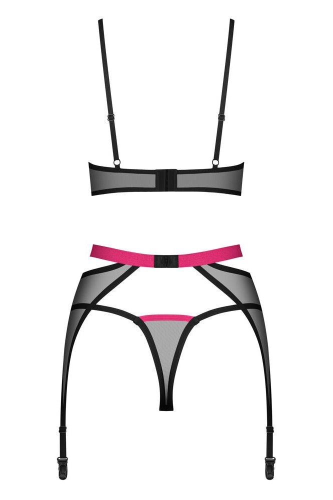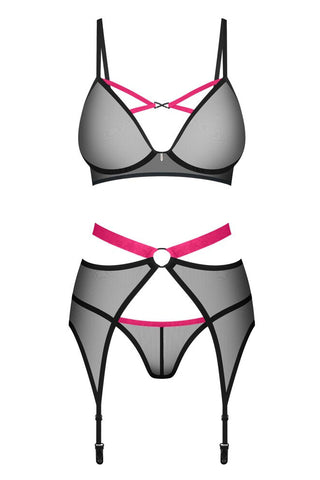 This three-piece set, featuring a wireless bra, suspender belt, and matching thong, is crafted from a soft, transparent powernet that hugs your curves while providing an elegant, sheer look. The vibrant pink strap accents add a modern and alluring detail.