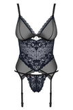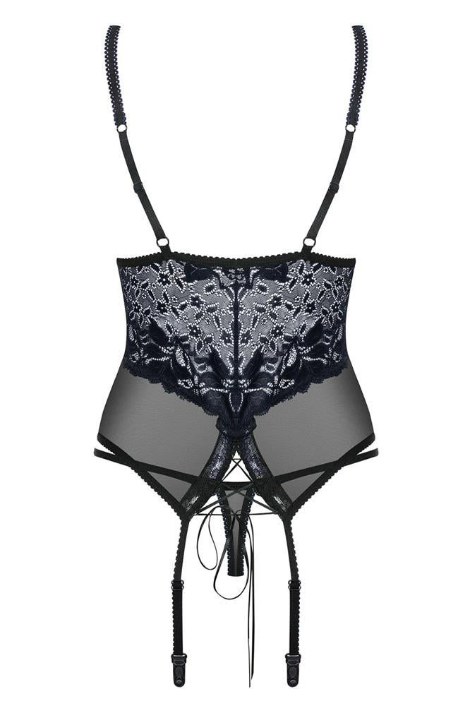 Elegant Seduction with Daring Details: This basque is crafted from transparent material, creating a sensual silhouette. A small cut-out and a rhinestone between the breasts draw attention to the cleavage area. The back of the basque is decorated with delicate lace and features small lacing, adding a striking, adjustable detail.