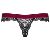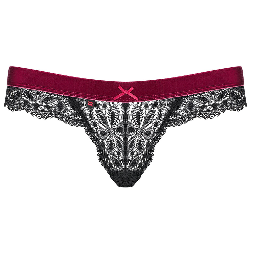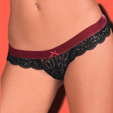 A Daring, Elegant Design: The thong is made from soft, stretchy black lace, providing an intricate and sensual texture. This is beautifully contrasted by a velvety, burgundy-colored waistband that adds a touch of luxurious detail and a pop of color.