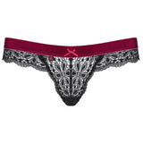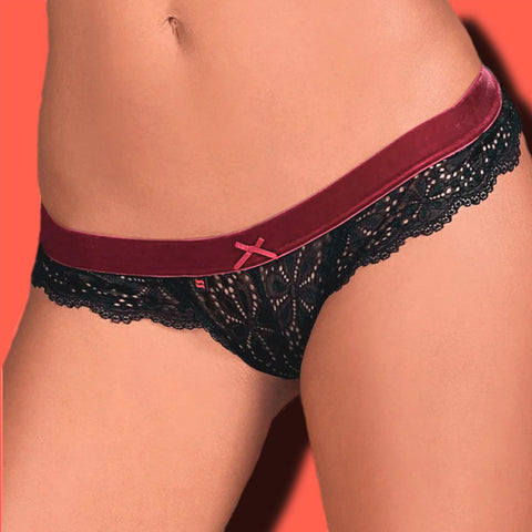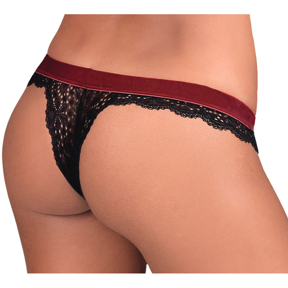 This thong is a testament to confident style, combining a classic black lace with a bold, contrasting velvet detail to create a look that is both captivating and incredibly comfortable.
