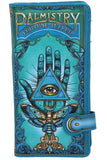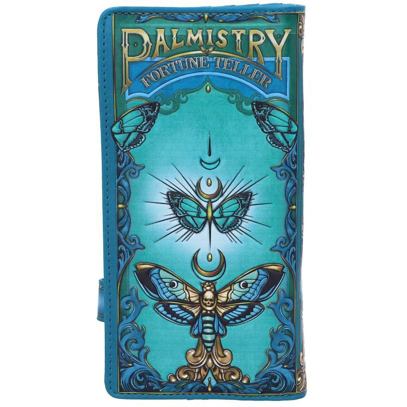 featuring the Palmistry Fortune Teller. Designed with precise detailing, stunning colours of aqua blue and metallic gold, the front of the wallet shows a symbolic palm with the Eye of Providence and a skull butterfly. This beautiful wallet is sure to keep all your cash safe!