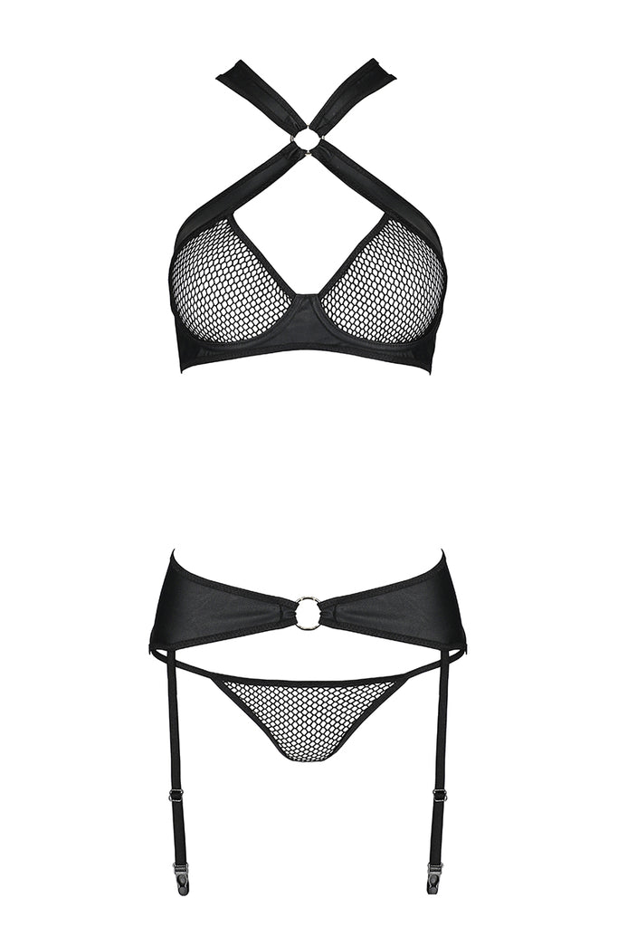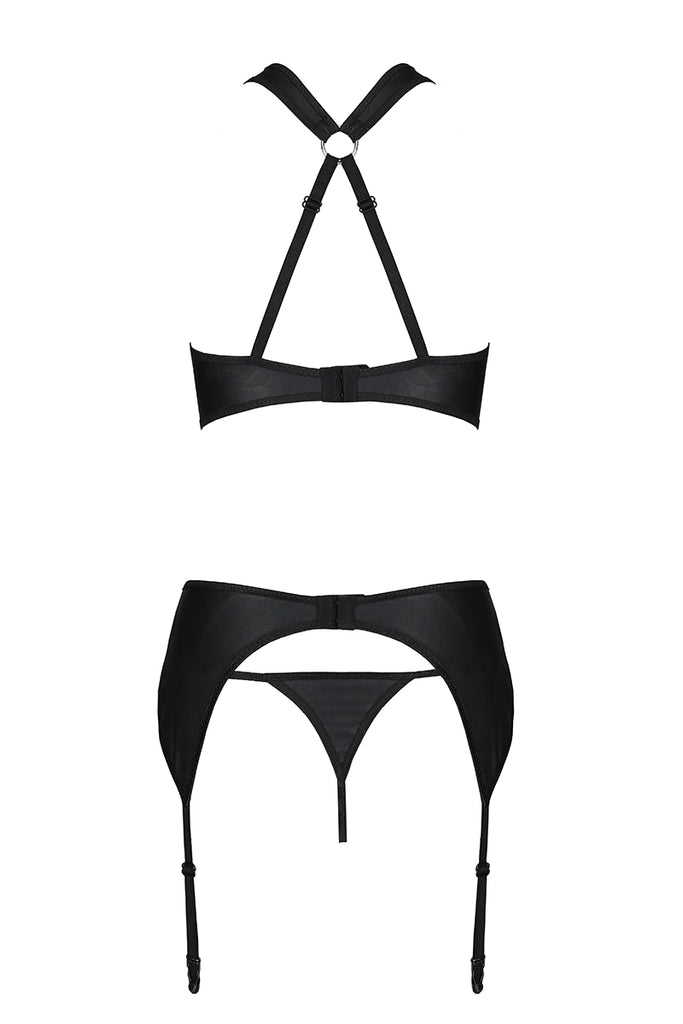 The Amanda Set is a masterpiece of desire. The leather bra, adorned with alluring mesh inserts, offers a tantalizing contrast of textures. The matching garter belt and thong, embellished with striking golden ring-shaped links, complete this seductive ensemble. Adjustable straps ensure a perfect fit, allowing you to customize your comfort and style.
