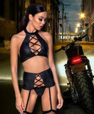 Introducing the Passion Lingerie Nancy Set, a daring and seductive three-piece ensemble designed to ignite your senses. This striking set features a captivating top fastened at the neck, a sultry garter belt, and boldly cut thongs, all crafted in a luxurious black leather look adorned with intricate crisscross stripes.