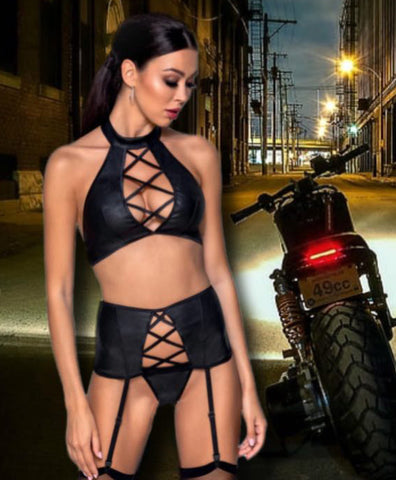The Nancy Set is a daring and provocative choice for the modern woman. The crisscross stripe detailing adds a touch of edgy sophistication, while the black leather look exudes confidence and allure. Whether you're planning a special occasion or simply want to elevate your everyday look, this set is the perfect choice.