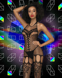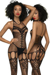 The fancy details make this fine mesh bodystocking a special treat: The front and back are adorned with small cut-outs that draw attention to your curves. And your back is presented in all its glory thanks to the halter straps. Your legs will also get their grand entrance by the elegant ornaments adorning the suggested suspender stockings on the front and back.