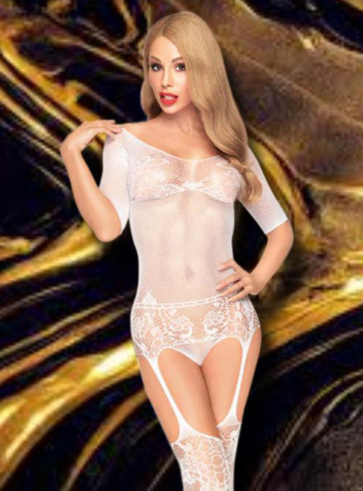 Honeymoon at the Bahamas? This bodystocking lets your fantasy run wild! In this suspender bodystocking you will feel sexy, playful and innocent at the same time - and you will immediately turn your sweetheart's head. The white, fine-meshed mesh of the bodystocking is alternated by delicate lace and hugs your curves. The Carmen neckline sets a seductive accent on your cleavage and your collarbone. The hot look is rounded off by the suggested suspender stockings.