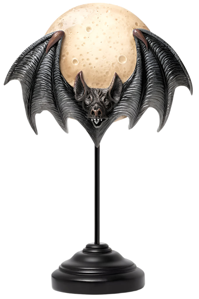 Taking flight under the baleful gaze of the hunter's moon. Mortals beware, for tonight the Strigio comes to claim your first born. Embrace the enchanting allure of the night with our captivating full moon and flying bat statue, a perfect addition for lovers of all things nocturnal. This stunning piece beautifully captures the essence of the night sky, featuring a detailed full moon that serves as a striking backdrop for a soaring bat.