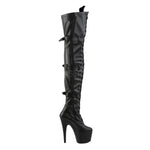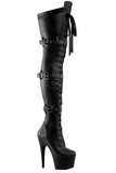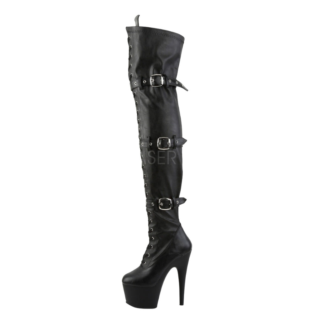 Black leather look thigh high boot with two and three quarter inch platform sole, seven inch stiletto heel, black ribbon lacing (red ribbons included in box), three adjustable straps and zip fastening. Perfect for any Gothic or Fetish Outfit.