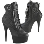 Crafted from premium black faux leather, these ankle boots exude a luxurious and modern aesthetic. The intricate lace-up front and buckled ankle strap add a touch of rebellious charm, while the quilted side panels bring a unique dimension to the design. The towering 6-inch stiletto heel and 1 3/4-inch platform create a dramatic silhouette that elongates your legs and demands attention. But don't be fooled by their bold appearance - these boots are surprisingly comfortable, making them perfect for both special occasions and confident everyday wear.