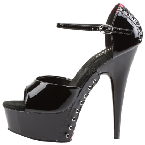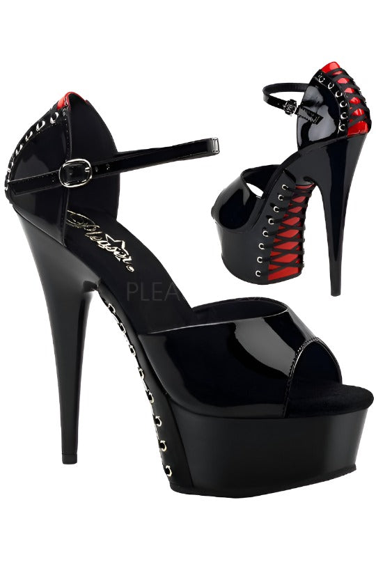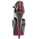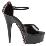Command attention and elevate your allure with the Pleaser DELIGHT-660FH, a striking open-toe sandal designed to turn heads. Crafted from a sleek black patent material with contrasting red backed laces, these stilettos exude confidence and sophisticated style. The 6-inch heel and 1.75-inch platform sole create a leg-lengthening silhouette that will make you feel powerful and glamorous. The unique design features a d'Orsay cut with a closed back for support, while red corset lacing winds its way up the heel and along the outer sole, adding a touch of playful intrigue.