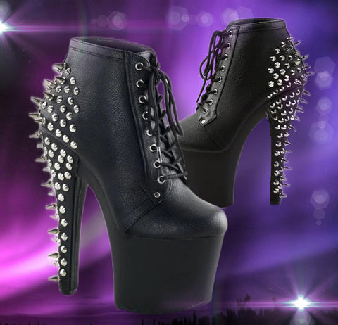 7" (17.8cm) Stiletto Heel, 2 3/4" (7cm) Platform Lace Up Ankle Bootie Featuring Spikes and Stones Adorning Heel and Back of Shoes.