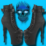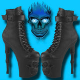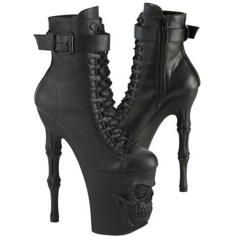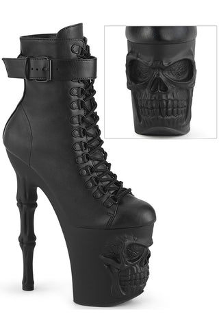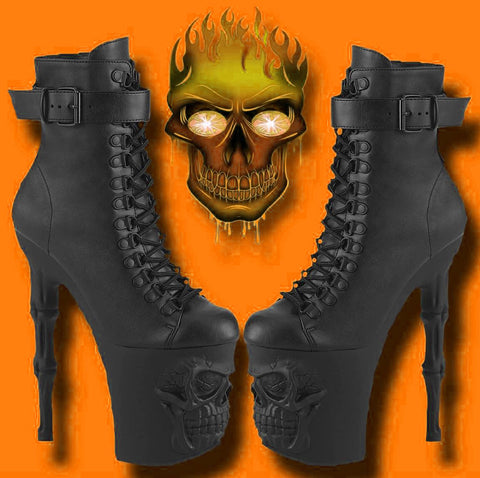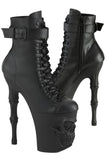 8" (200mm) Finger Bone Heel, 4" (100mm) Skull Sculpted Platform D-Ring Lace-Up Front Ankle Boot with Buckle Strap, Inside Zip Closure.