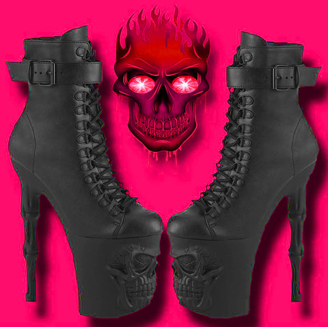 • Show-Stopping Height & Killer Platform: Command attention and elevate your look with a sky-high 8-inch finger bone heel and a striking 4-inch skull-sculpted platform.