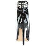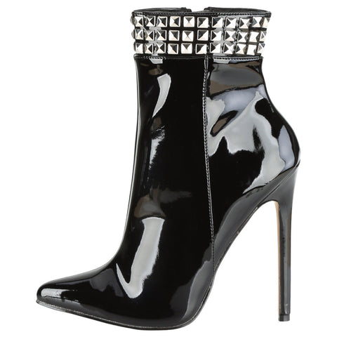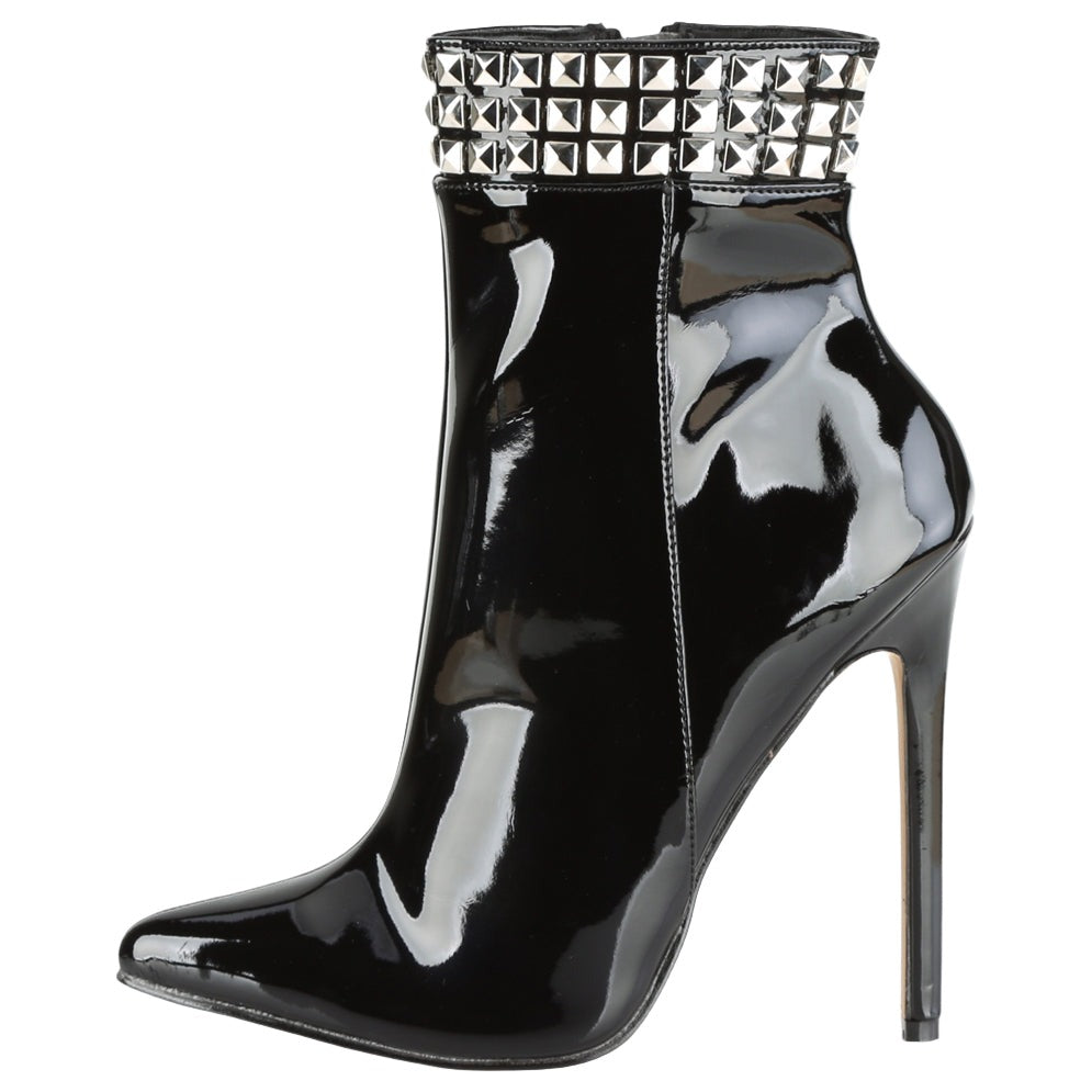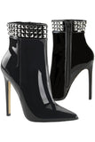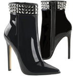Crafted from luxurious black patent PVC, these boots exude a captivating blend of modernity and rock-chic style. The towering 5-inch stiletto heel creates a dramatic silhouette that elongates your legs and demands attention. The standout feature is the edgy metal stud detail at the ankle, adding a rebellious touch to the overall design. But don't be fooled by their bold appearance - these boots are surprisingly comfortable, making them perfect for both special occasions and confident everyday wear.