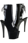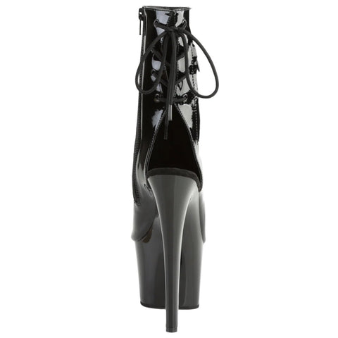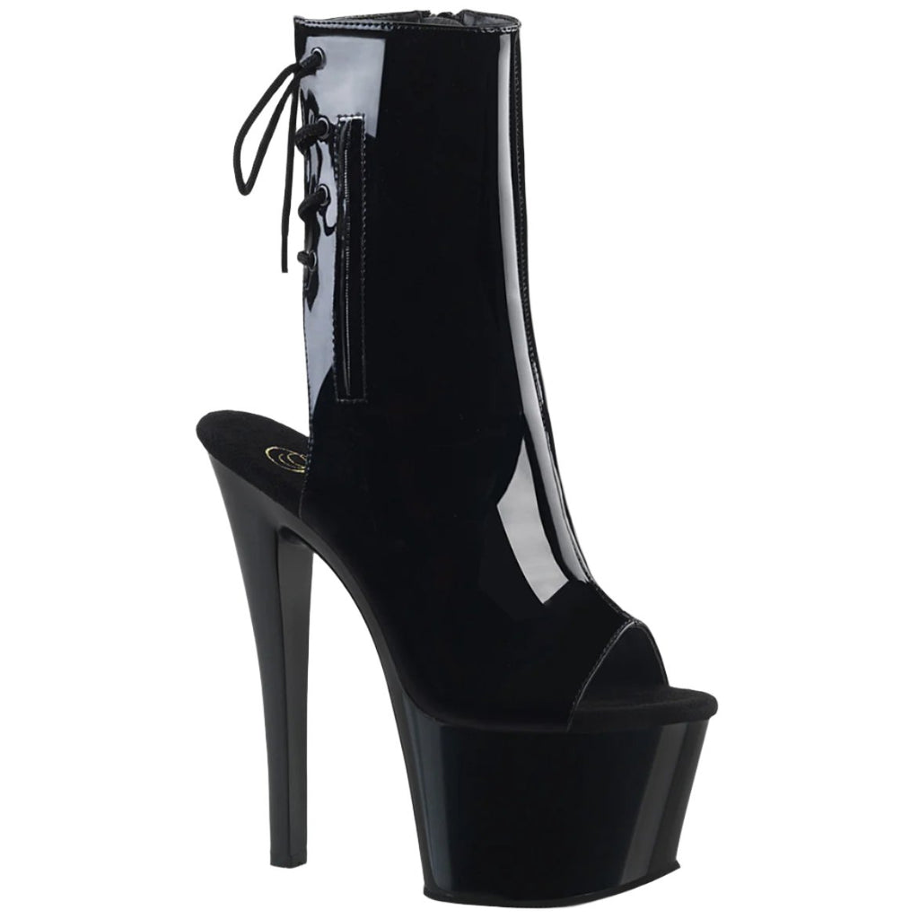 The Pleaser SKY-1018 boots are a bold statement piece designed for the confident and daring woman. These edgy ankle boots combine a sleek black patent PVC upper with a towering platform and stiletto heel, creating a look that's both modern and seductive. With their unique open toe/heel design, lace-up back, and hidden zip pocket, they offer a perfect blend of style and practicality.