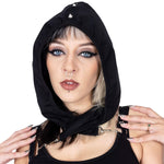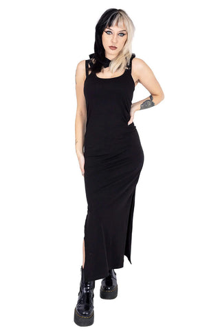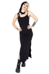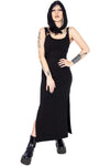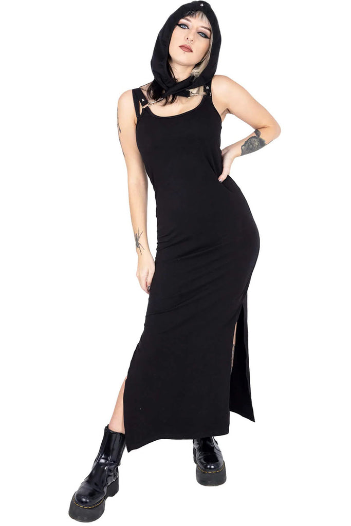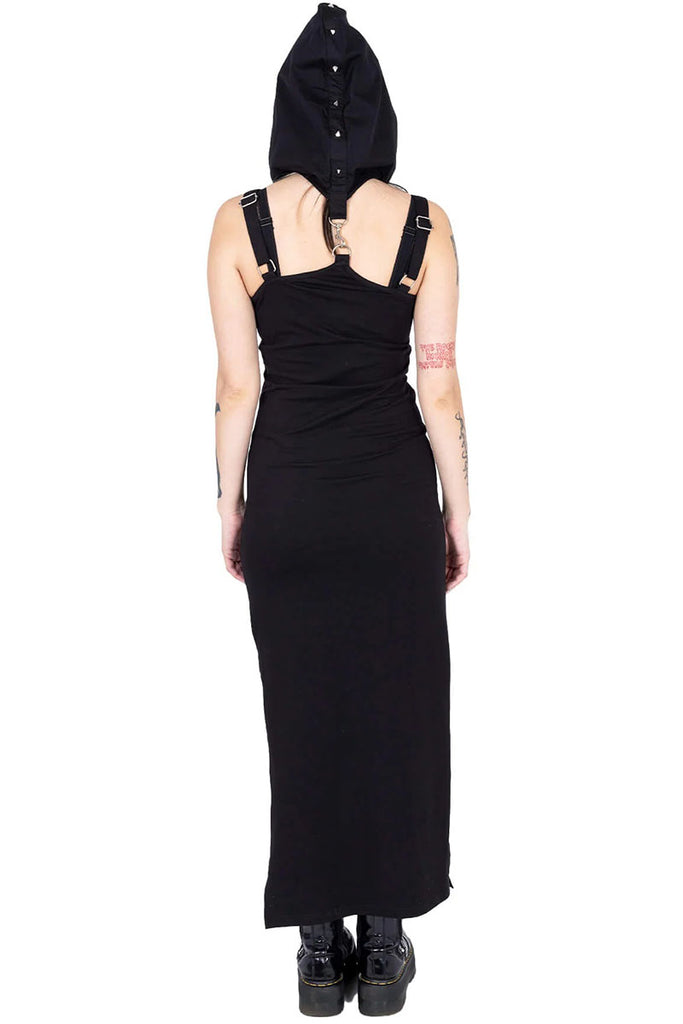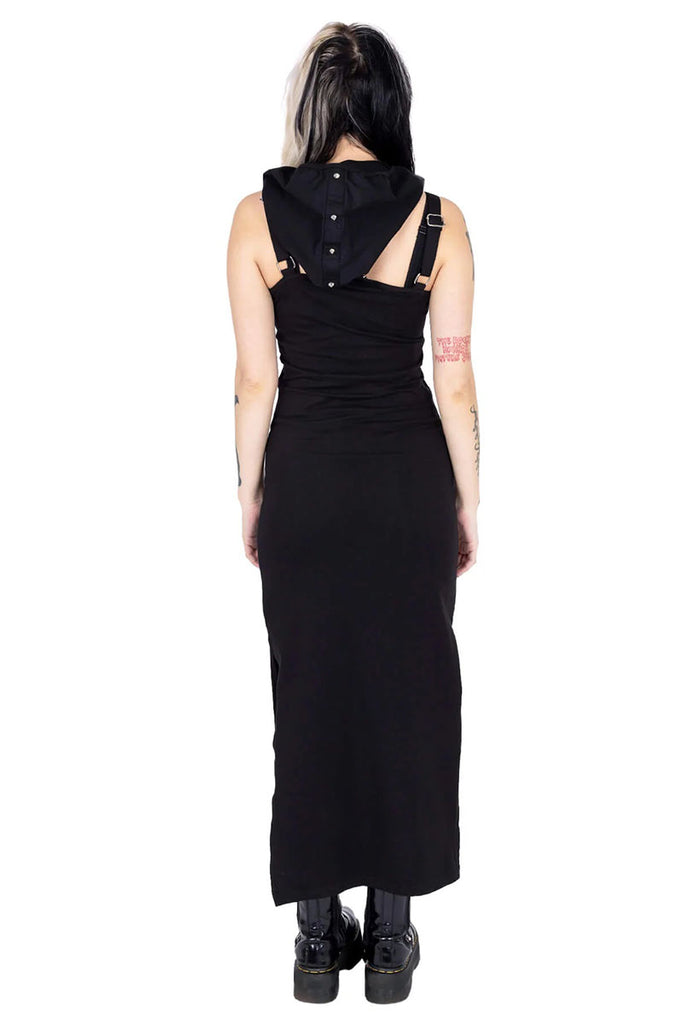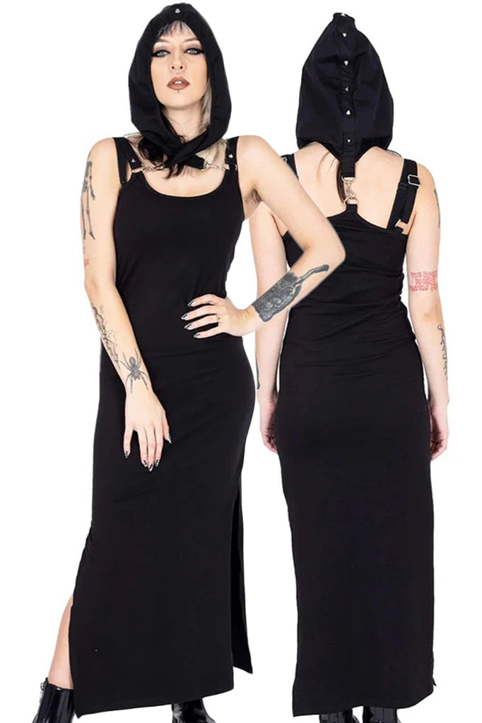 Long cotton dress with slits up the sides of the skirt. Dress has adjustable shoulder straps with silver ring and slider buckles. The dress features a clip on detachable hood which spike studs down the back.