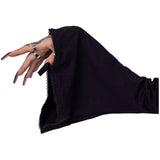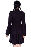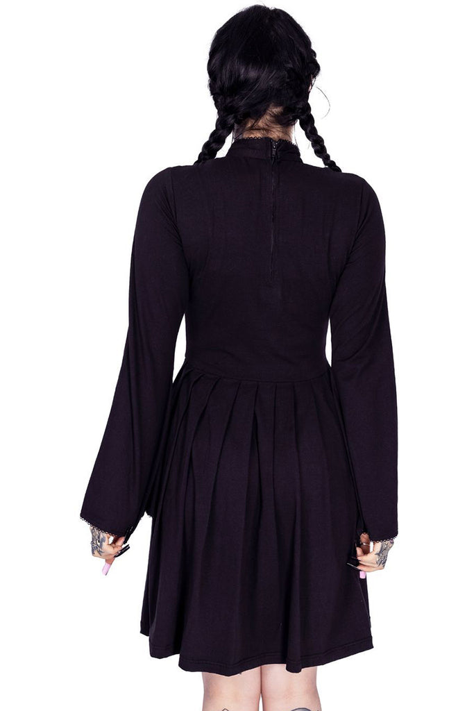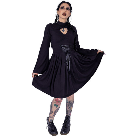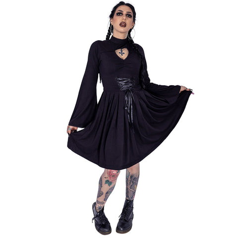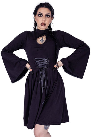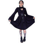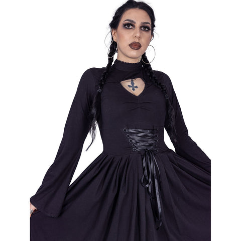 Black flared jersey dress with keyhole cut out on upper chest, flared bell sleeves and corset style ribbon lacing detail at the waist. Edges are trimmed with black scalloped elastic detail. High neck design with half zip at the back to fasten.