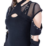 Black Gothic Top with flattering keyhole cutouts to the front and back, with black fishnet underlayer on the upper chest and shoulders. Adjustable buckle shoulder straps and sleeve cutouts on the upper arm. detachable long sleeves are fastened with spring clips so the top can be worn as long sleeve or short sleeve. Collar fastens with a buckle at the back of the neck. The sleeves have thumbholes.